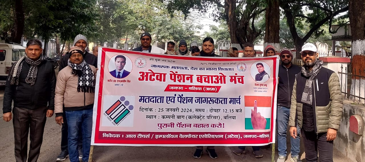 बलिया अटेवा प्रदेश नेतृत्व विजय कुमार बन्धु जी के आह्वान पर पेंशन बचाओ मंच, बलिया के तत्वावधान एवं जिला संयोजक समीर कुमार पाण्डेय के नेतृत्व में *"मतदाता एवं पेंशन जागरूकता मार्च"* पूरे उल्लास के साथ निकालकर कर्मचारियों एवं जनमानस को अपने वोट के अधिकार के प्रति सचेत किया गया। इस यात्रा के द्वारा कर्मचारियों ने न केवल जनजागरण का कार्य किया बल्कि सरकार को सचेत भी किया कि कर्मचारी सरकार के हाथ पांव है। अतः सरकार भी शिक्षक/कर्मचारियों की पुरानी पेंशन बहाली के प्रति अपना नजरिया परिवर्तित करे और उनकी पुरानी पेंशन बहाल करे। साथ ही साथ धडल्ले से किए जा रहे निजीकरण को बंद करे। समर्पित मार्च कम्पनी बाग़(कलेक्ट्रेट परिसर) से आरंभ होकर शहर के विभिन्न मार्गों से होते हुए जिलाधिकारी कार्यालय परिसर में सम्पन्न हुआ